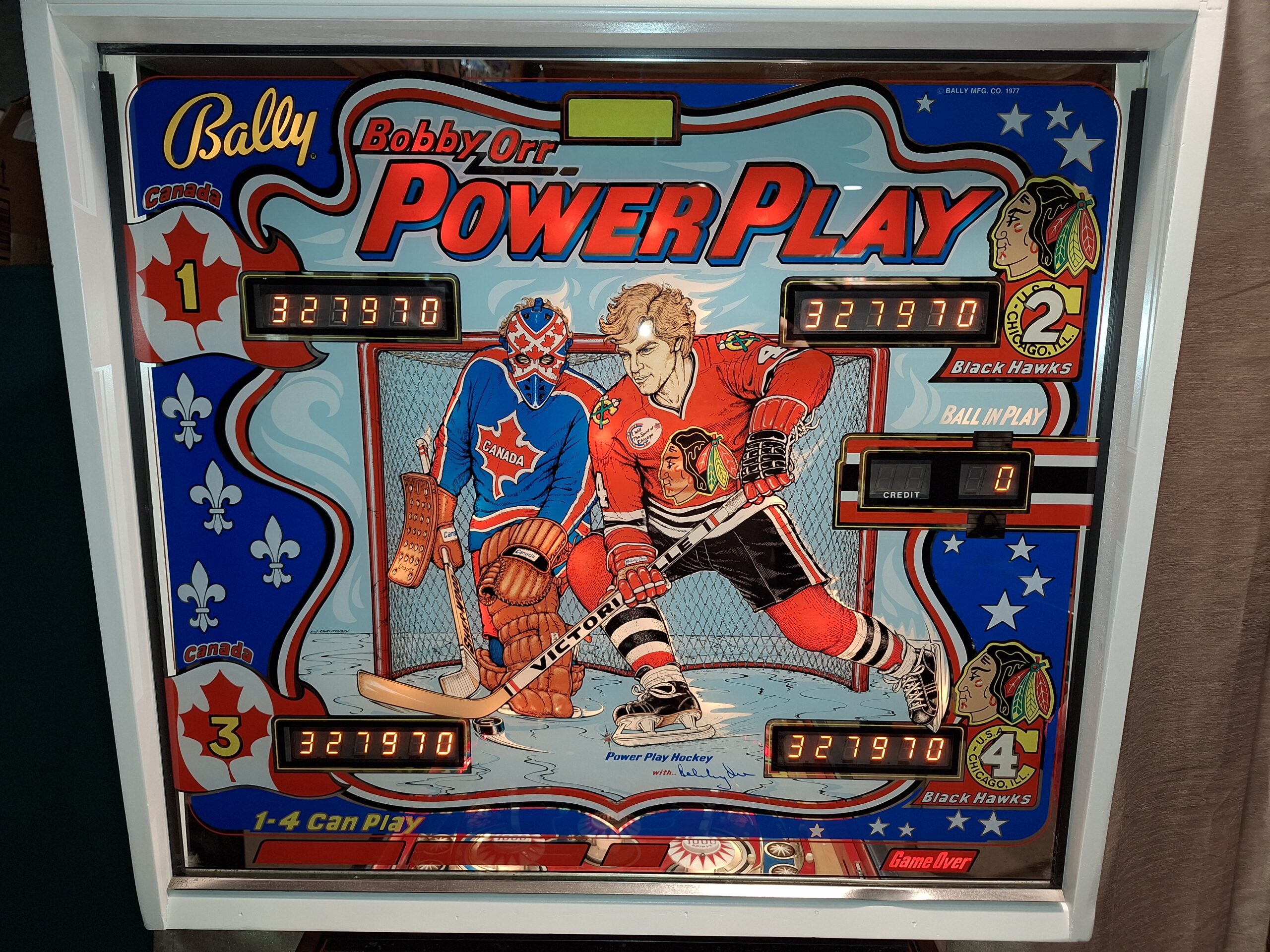 Now available FOR SALE in time for Christmas! Presenting this wonderful all original and restored to look and play like new Bally Bobby Orr Power Play. Over 50 hours of restoration work went into this beloved Bally hockey themed pinball machine from 1977. Everything has been rebuilt and optimized to play even better than when it first hit the arcade back in 1977! Flipper, pop bumper, drop target assemblies all rebuilt with new parts. Circuit boards rebuilt and a new MPU installed. Correct tombstone style drop targets with blue bullseye graphics make this game POP! Looks and plays like new! Grab this game for the hockey fan and pinball fan in YOU! Click the image to see it in action!